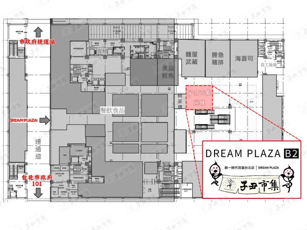 本次子丑市集位於 台北信義 DREAM PLAZA B2 餐飲樓層,空間連接 市政府捷運站地下動線,同時也是 信義商圈、台北101、百貨與辦公商圈往返的重要通道