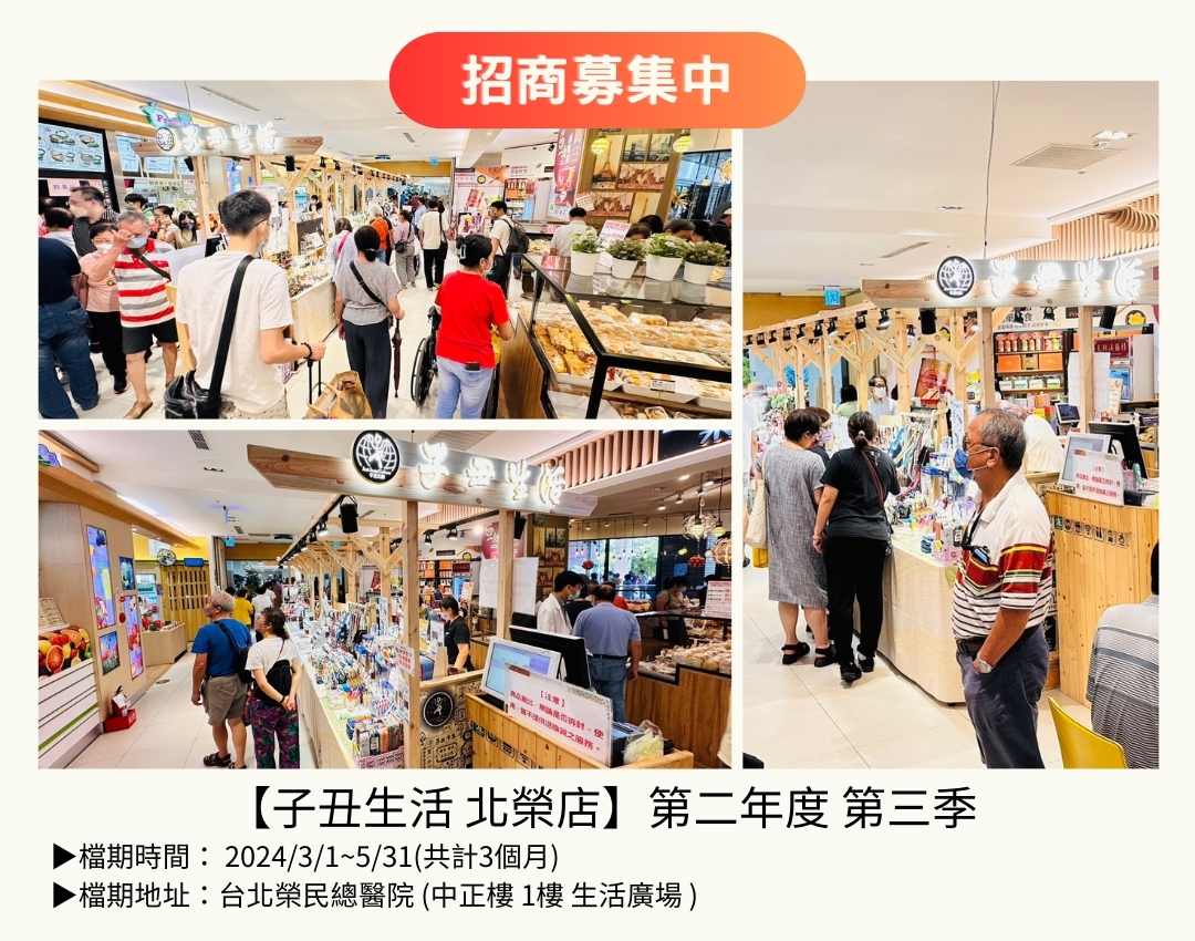 【子丑生活-北榮店】第二年度-第三季-▶️檔期時間:-202431531共計3個月-▶️檔期地址:台北榮民總醫院-中正樓-1樓-生活廣場-1-1